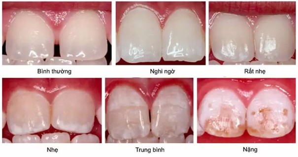 – MIH mức độ nhẹ: Có sự thay đổi màu trắng đục trên răng cửa hay răng hàm nhưng không có sự phá huỷ men sau mọc răng, có thể nhạy cảm ê buốt với kích thích bên ngoài như không khí, nước nhưng không nhạy cảm khi đánh răng.