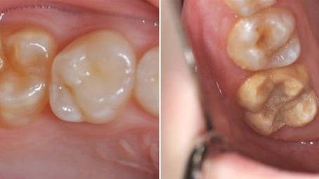– MIH mức độ nặng: Màu trắng đục đồng thời có sự phá huỷ men sau mọc răng, cảm giác nhạy cảm tự phát và dai dẳng khi đánh răng và ăn nhai.